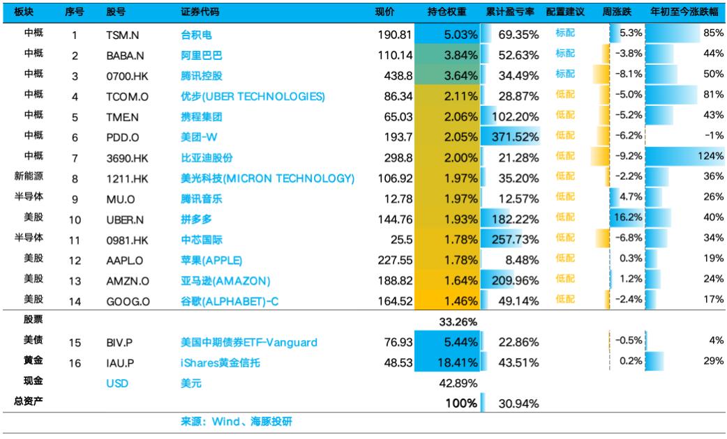 Alpha Dolphin虚拟组合共持有14只股票和股权ETF,其中3只为标准,8只为低配股。其它分布在黄金、美国国债和美元现金上。截至上周末,Alpha Dolphin 财务规划分配和权益资产持股权重如下: