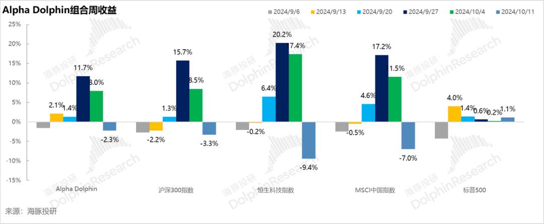 10月12日周,Alpha 与沪深300(-3.3%)相比,Dolphin虚拟组合收益下降2.3%,跑输标普500指数,但强于沪深300。、恒生技术(-9.4%)和MSCI中国(-7%)。这主要是因为海豚君削减了中国的资产配置后,美国股票的重量相对上升,对冲了中国股票下跌的影响。