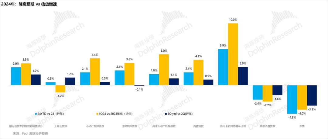 这恐怕也是十年期美国债券迅速上涨到4%以上的主要因素。但这里有趣的一点是,在通货膨胀上升的过程中,居民和企业的贷款增长并不明显,甚至进一步放缓。换句话说,目前50个基点的降息远远不会伤害居民增加杠杆,也不是因为降息刺激居民和企业借贷。