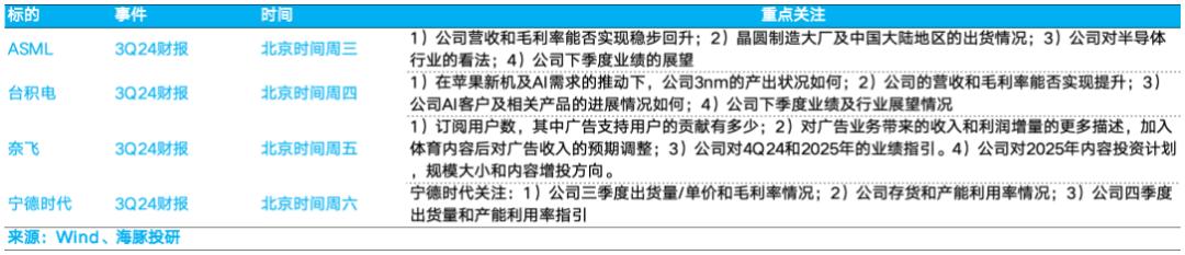 本周正式进入美股第三季度财务报告。前两家半导体巨头ASML和台积电可能会透露一些关于最近半导体再次上涨的信息。此外,奈飞的上行周期特别长,下半年内容竞争是否加剧值得关注。此外,作为最近创业板的主力军,宁德时代被大幅拉升,但公司第三季度业绩能否承担如此大的增长也值得关注。