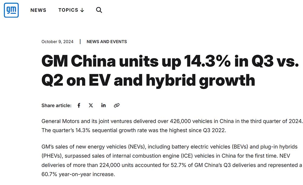 其中,纯电动汽车和插电式混合动力汽车占53%,这是通用汽车新能源汽车(包括纯电动和插电式混合动力汽车)销量首次超过燃油汽车。