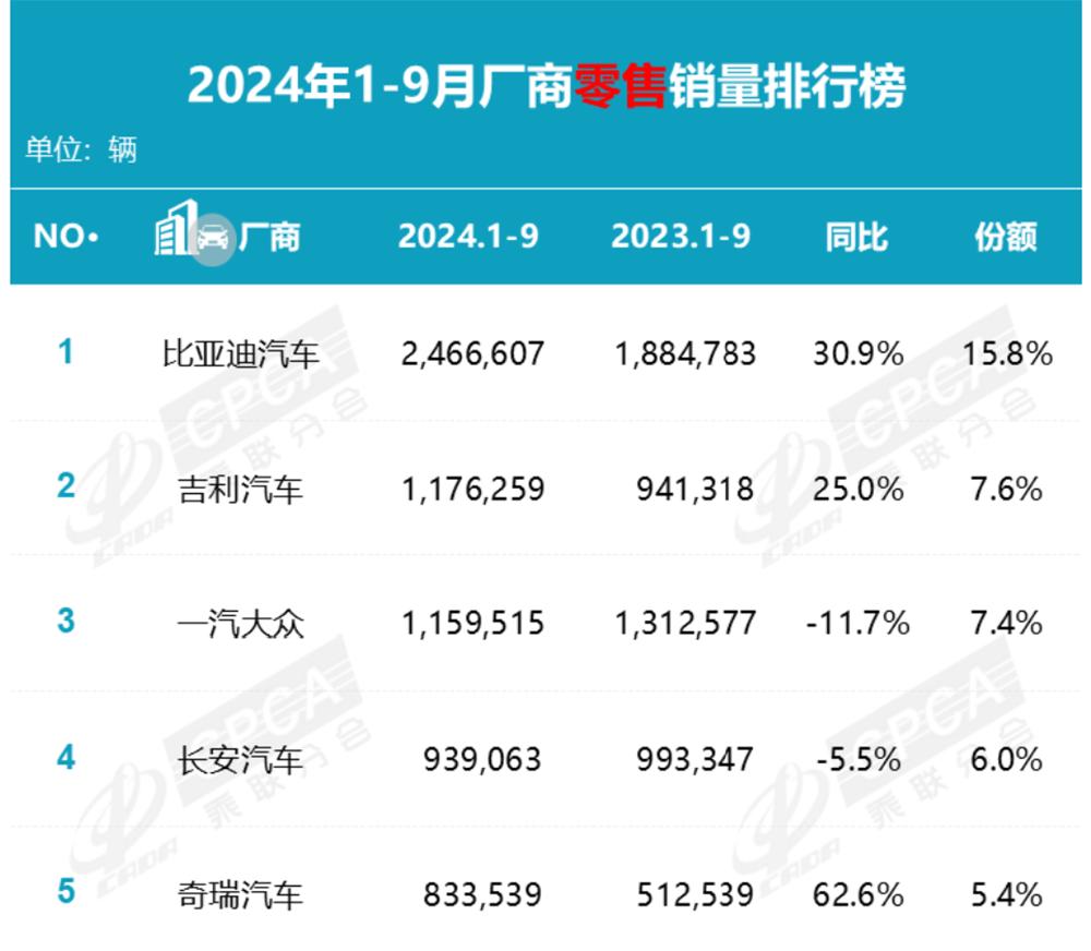 ▲今年前三季度制造商零售销售排行榜前五(图源乘联会)