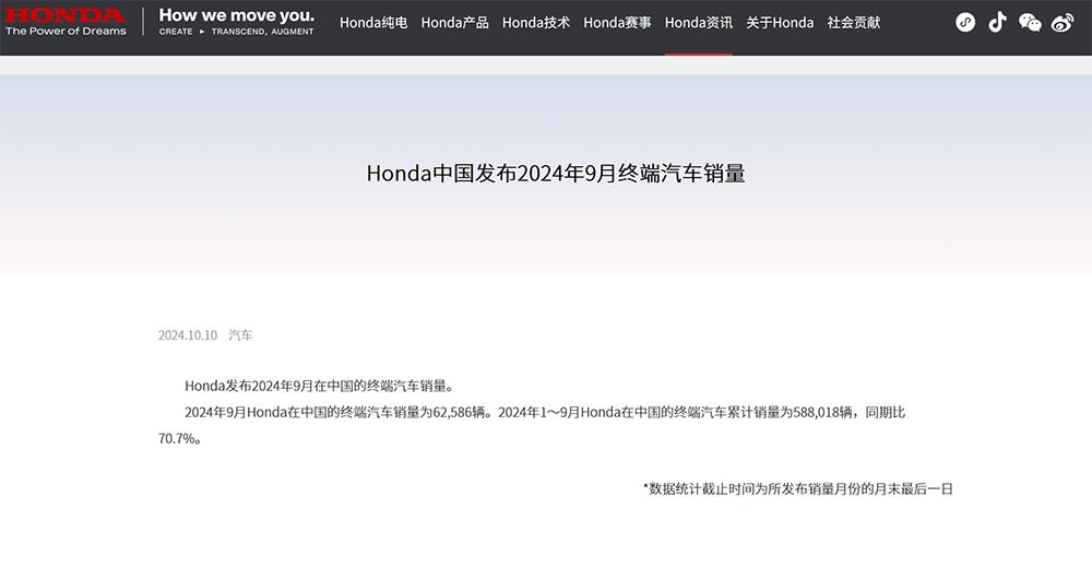据本田中国公布的最新销售数据显示,2024年前三季度,本田汽车在中国市场的累计销售额为58.8万辆,较去年同期下降29.3%。