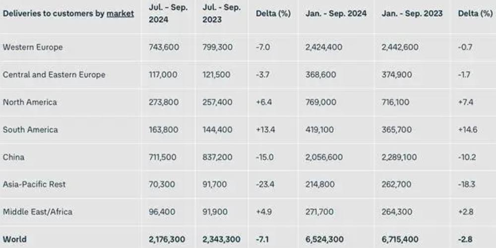 根据大众汽车公司曝光的第三季度销售数据,全球第三季度大众汽车公司销量同比下降7.1%,达到217.6万辆;第三季度纯电动汽车(BEV)销售额达18.9万台,比去年同期下降9.8%。