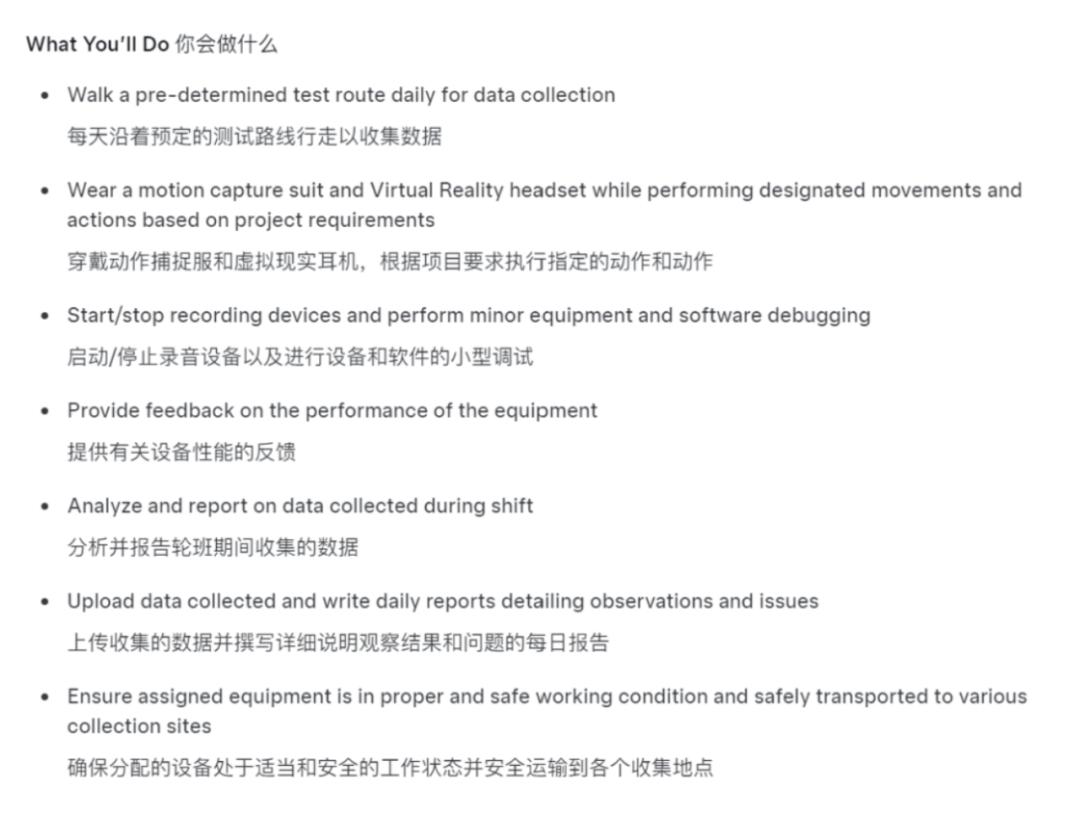 最近,特斯拉的进一步增加数据收集操作员(Data Collection Operator)征集力度,这些操作人员通过佩戴 VR 使用高精度传感器和动作捕捉服,为机器人提供高质量的训练数据。
