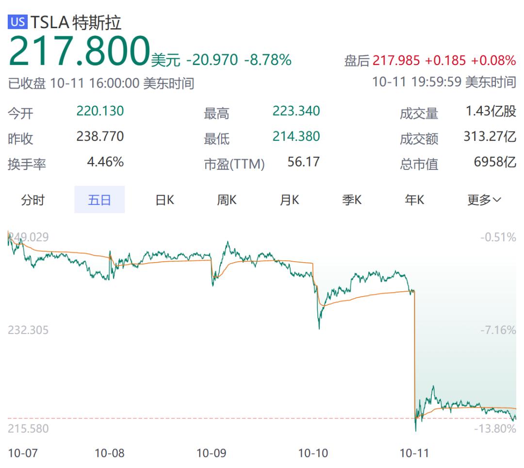 麻醉了!特斯拉“跌倒”We, Robot新闻发布会结束后的第二天,投资者集体投票,最终股价暴跌8.78%,创下2个月来的最大跌幅。