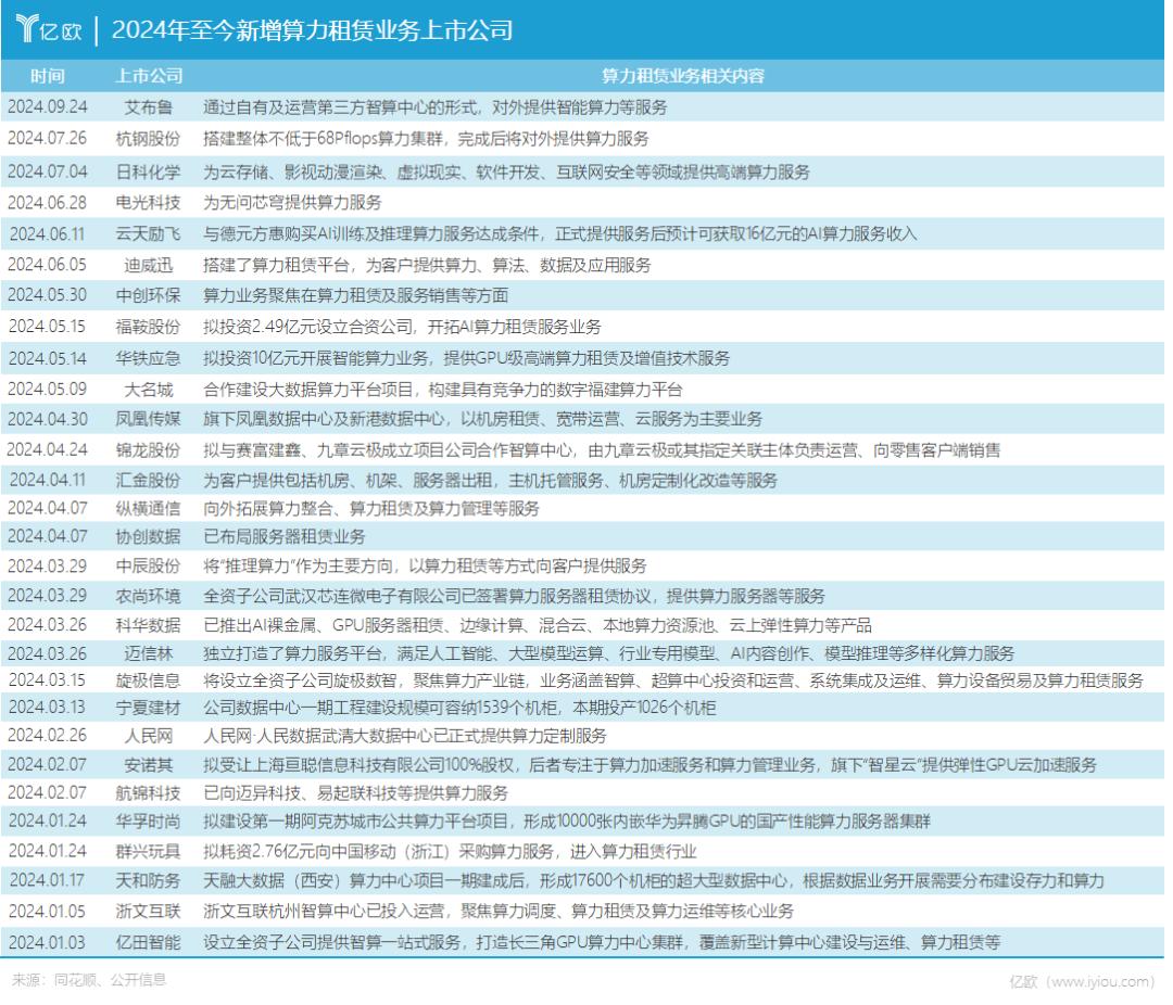 根据亿欧网查询,今年以来,大约有29家上市公司宣布进入计算租赁市场。,包括艾布鲁、杭钢、日本化学、电光科技、云天励飞、迪威迅、中创环保、福鞍股份、华铁紧急、名城、凤凰传媒、金龙股份等。