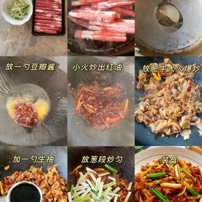 1、烧开水,将肥牛卷焯水,变色捞出。 锅烧油,大蒜爆香,放一勺豆瓣酱文火炒红油,放肥牛大火翻炒,加一勺酱油调味,加葱段炒匀盛出。