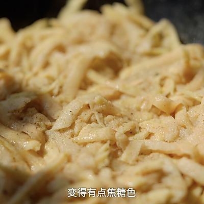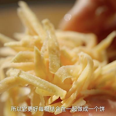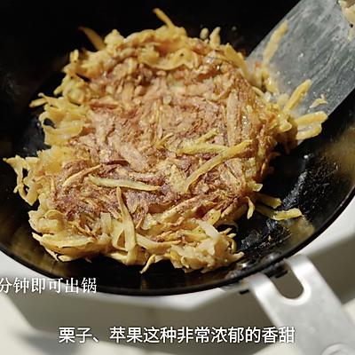 3、提前将铁锅中火预热至滴水成烟状态。 改为文火。锅里放一层薄薄的油,根据大锅的大小,把调好的红薯苹果丝放进去压紧,呈现出厚度不超过。 1 一厘米的蛋糕。这个步骤是成功的关键:一定要卡紧。