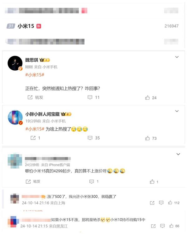 小米15突然冲上微博热搜榜 网民热议:希望不要涨得太多