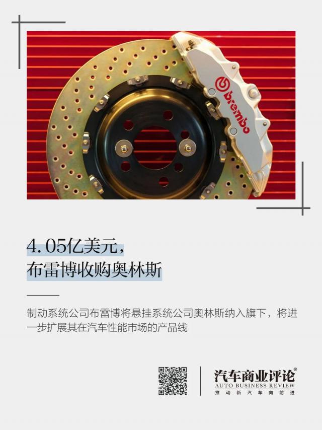 布雷博,意大利(Brembo)公司在 10 月 11 日本的一份声明显示,布雷博和阿波罗全球管理公司(Apollo Global Management, Inc.)天纳克基金管理子公司(Tenneco)签订协议,以 4.05 以1亿美元的现金价格收购奥林斯跑车(Ö hlins Racing)公司 100% 的股权。
