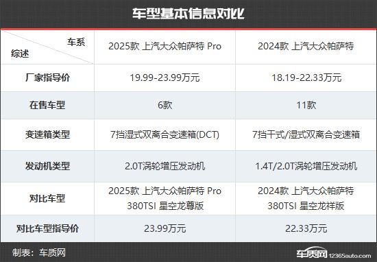 2025 上汽大众帕萨特 Pro 共推出 6 与老款车型相比,车型起步价上涨。 1.8 一万元,顶配价格贵出 1.66 万元。就车型数量而言,新车仅推出。 6 与老款车型相比,车型减少了。 5 款。为了更直观的比较,我们选择了两款价格相近的车型进行比较,可以更直观的看到新老车型在配置上的具体差异。尽管两者的价格相差甚远 1.66 一万元,但结合新车限时一口价,其价格达到 22.39 一万元,最终差价只有一万元。 600 元。