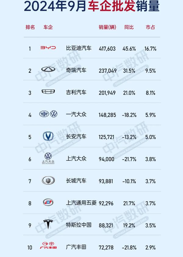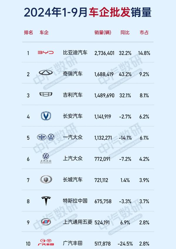2024年9月汽车公司销售排名:奇瑞超吉利 只有第九个特斯拉