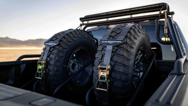 将搭载性能 18 英尺谢尔比锻造轮毂 37 英尺全地形轮胎,配置 BDS 悬挂式升降套件。后备箱内加入两个专属备胎支架,两个巨大的轮胎布局在内,整体竞技感极强。