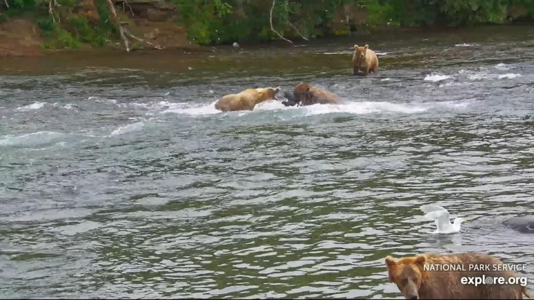 棕熊们将聚集在布鲁克斯河打捞鲑鱼,偶尔的攻击通常是短暂的。然而,母熊402和公熊469之间的矛盾持续了20多分钟。!两只熊在水中不停地咬、追、打,最后以母熊402体力不支,沉入水中溺水而告终。
