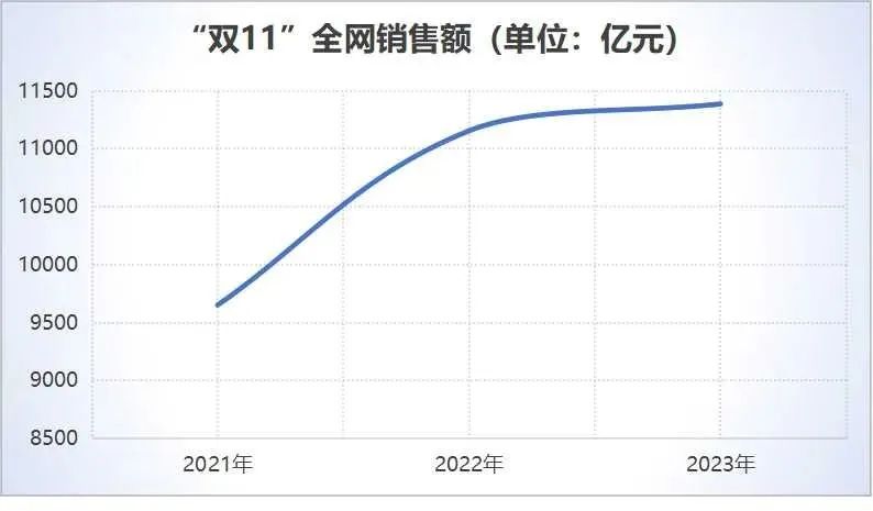 根据2021年至2023年双11全网销售数据,虽然销售额仍在增长,但增长速度已明显放缓。