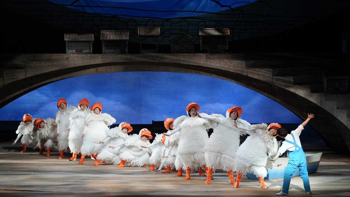 “在动作设计上,我们尽量模仿鹅走路的形式,然后我们会使用京剧的武丑技巧。有一幕,鹅要从2米多高的桥上飞下来救人,就用了京剧里的高空翻技巧。”曹阳阳说。