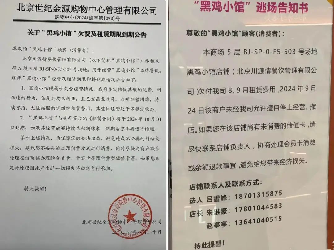 上面写到,"黑鸡小馆欠我们公司8、9月份的租赁费,2024年9月24日,该商家未经我公司许可,私自停止经营,退店。..”甚至曝光了品牌法人、店长的名字和电话号码。
