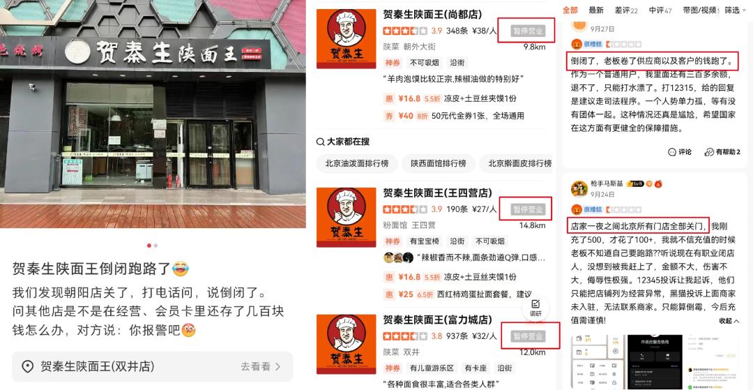 举例来说,被很多农民工称为“全北京最正宗的陕西面”“贺秦生陕面王”,朝阳店被网友曝光“倒闭跑路”。内参君在公众评论中获得,这家连锁面馆、国际贸易店、尚都店、王四营店、R&F城店都显示“暂停营业”。还有大量网友斥责“我们也在这里充值,还剩2800多元,浪费了水”,“老板拿着供应商和客户的钱跑了”,也有人好奇“之前生意挺好的!可能是价格太低,盈利模式很难支撑运营”。