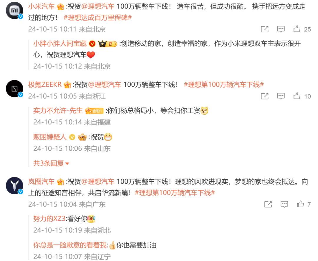 就在理想微博官宣达到百万的时候,小米汽车、极氪汽车、岚图汽车也率先向理想发送贺电,祝贺其达到100万辆全车下线。