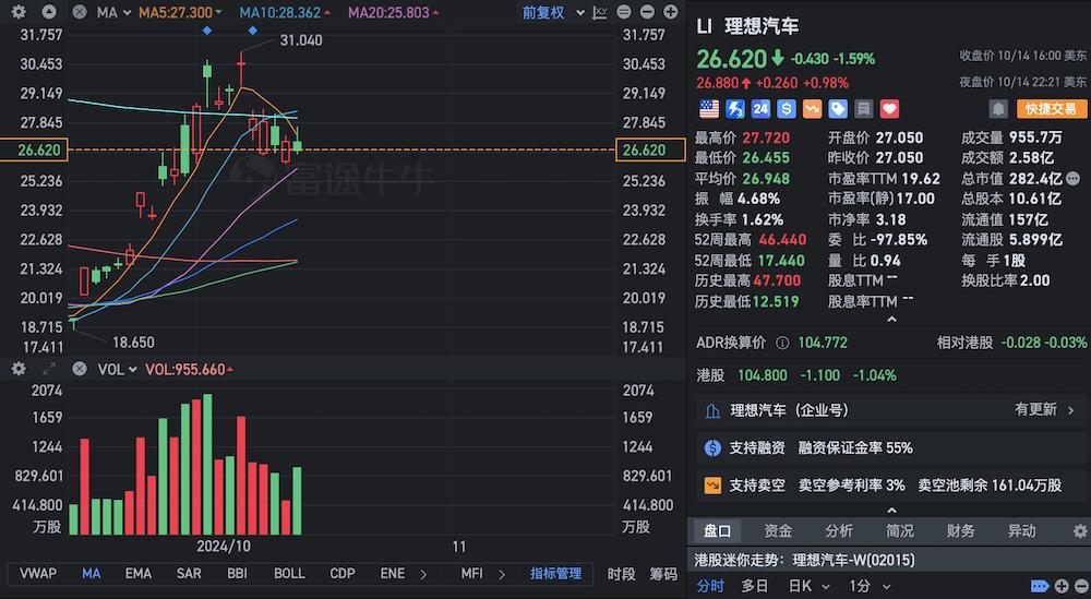截至目前,理想股价夜间小幅上涨,报26.88美元/股(约合人民币190.88元/股),总市值282.4亿美元(约合人民币2005亿元)。