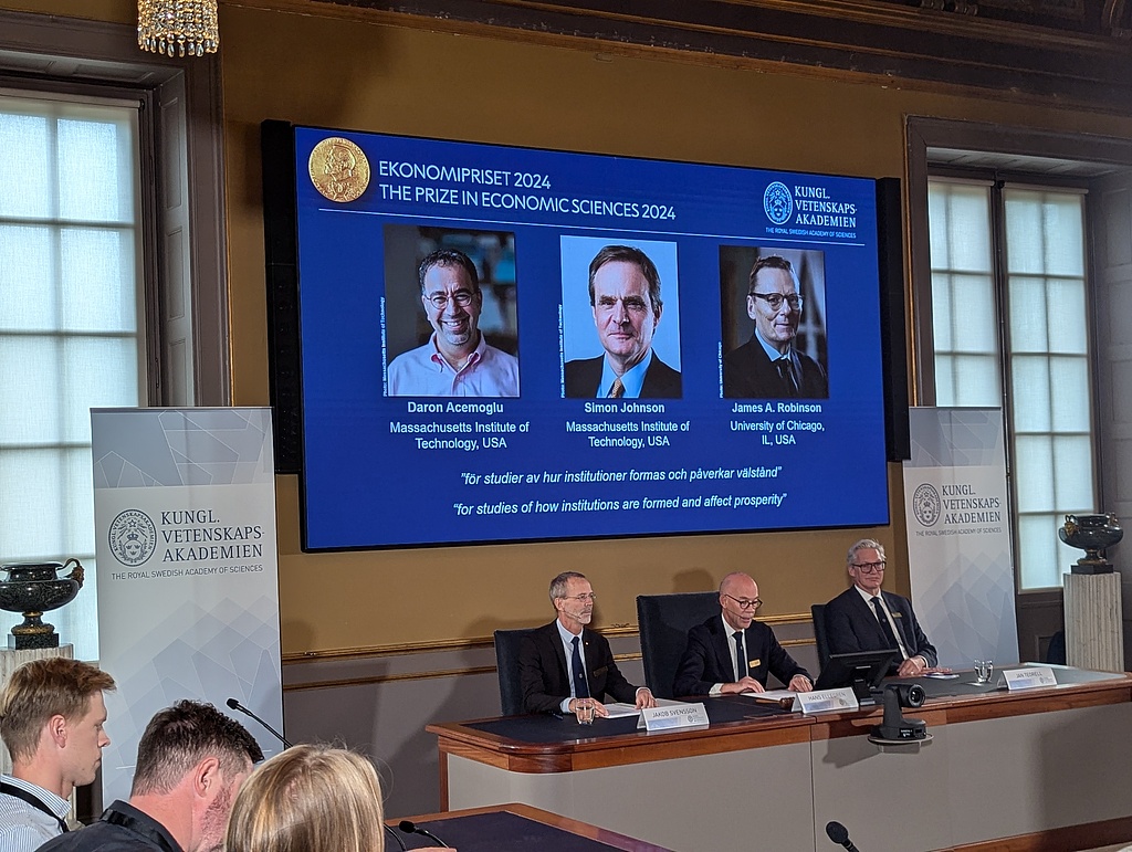 瑞典皇家科学院于当地时间10月14日宣布,将2024年诺贝尔经济学奖授予达龙·阿西莫格鲁。(Daron Acemoglu)、西蒙·约翰逊的MIT教授(Simon Johnson)、詹姆斯,芝加哥大学教授·A·罗宾逊(James A. Robinson)三人,对制度如何形成和影响经济繁荣研究领域的杰出贡献给予表彰。