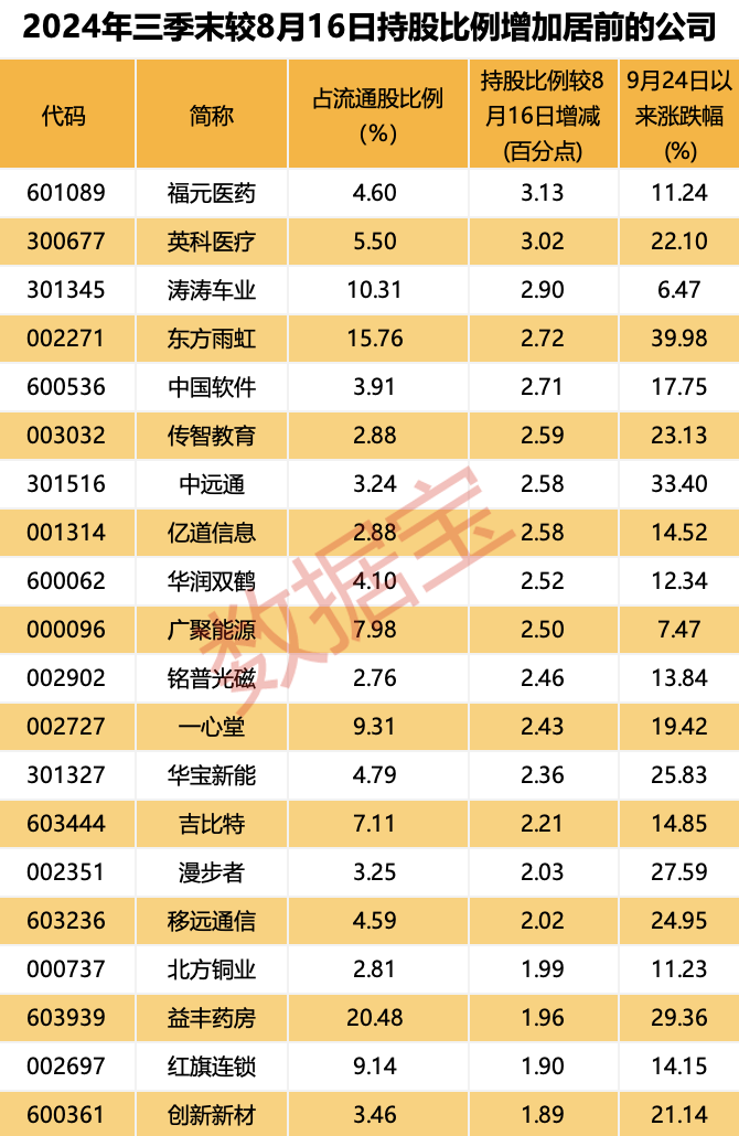 从市场表现来看,与8月16日加仓最大的公司相比,最新持股比例整体表现相对较好。9月24日至今(截至10月14日),加仓幅度超过0.5%的公司平均涨幅超过24%。;加仓幅度小于0.3%的公司同期上涨幅度仅为23%。
