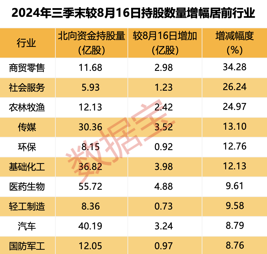 与8月16日相比,三季度末北向资金持仓环比增长的行业数量高达29个;在这些人中,银行的持仓增加最多。,最近拥有249.17亿股,比上年增长11.84亿股。电气设备、公共事业等领域的头寸也在增长,头寸比上年增长5.55亿股和5.37亿股。