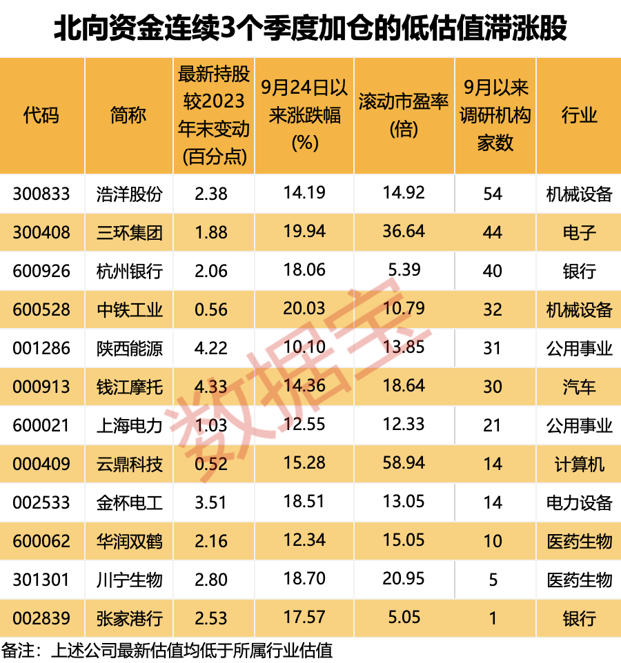 此外,据数据宝统计,与9月底相比,北向资金连续三个季度获得加仓的244只陆股通成份股中,自9月24日以来,跑输沪深300指数(23.2%)、最新市盈率低于所属行业市盈率,9月份至今只有12只股票被机构调查;其中包括2只公共事业股、2只机械设备股和2只医药生物股。