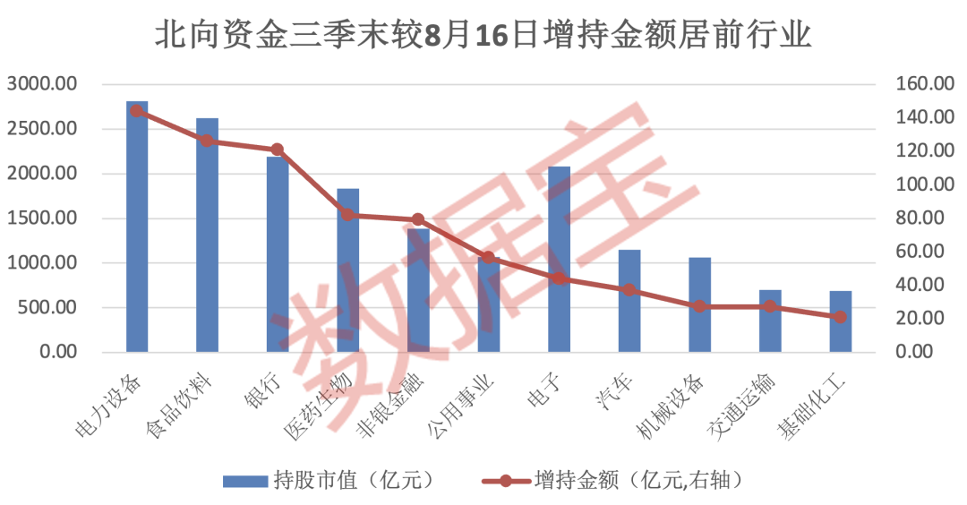 从板块来看,市场上的所有板块都被北向资金增加了。其中,科技创新板股持仓增幅最大,第三季度末持仓比8月16日增长15.86%。;第二个是创业板,持仓增长8.76%。