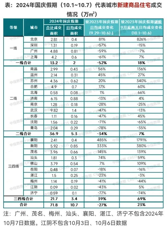 机构统计显示,国庆假期7天的新房成交情况总体是:一线城市北上广深成交13.2万平,二线城市11座城市成交36.9万平,三四线城市10座城市成交21.7万平。从绝对数值来看,二线城市、三四线城市的增量市场都超过一线城市。