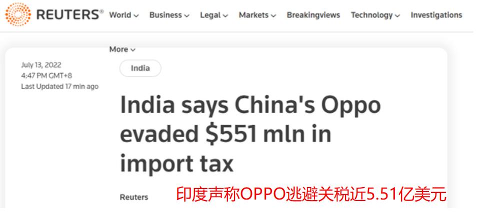 2022年7月,印度税收情报局又指控OPPO逃税5亿美元。