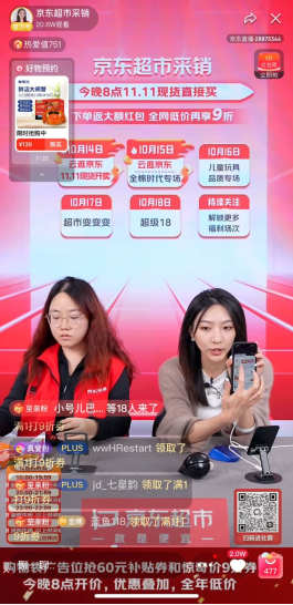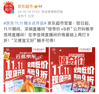 双十一猫狗之争宣战,京东超市采销直播间与李佳琦同价再打九折。
