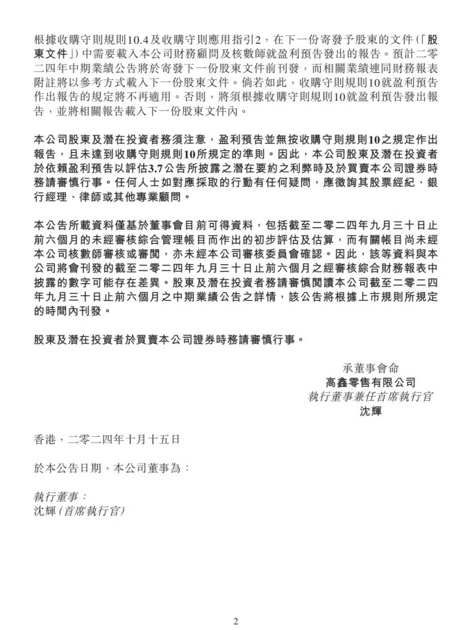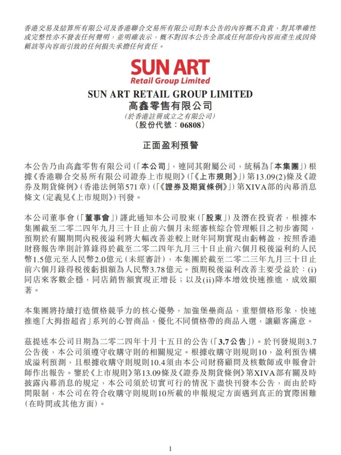 另外,高鑫零售也宣布,2024年9月27日,公司股东大会收到一封有意要求人发出的触摸函,有意要求人表示,有意要求公司在受制于各种事项的情况下,对公司发行的所有股份提出自愿有条件的要求,并提出取消公司发行的所有未行使购买股份的要求。