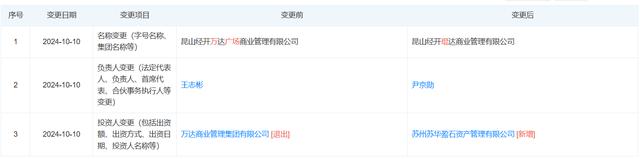 天眼查App显示,近日,昆山经济开发万达广场商业管理有限公司发生工商变更,企业名称变更为昆山经济开发万达商业管理有限公司,原全资股东万达商业管理集团有限公司撤出,苏州苏华盈石资产管理有限公司为股东,全资持有股份。与此同时,许多主要人员发生了变化。