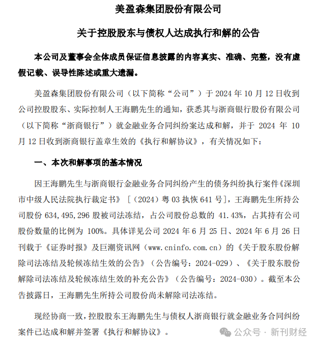 根据这一和解协议,王海鹏以7.35亿元为欠款资本,按约定向银行偿还贷款。资金偿还后,浙商银行同意部分消除王海鹏查封的美盈森股票的冻结。