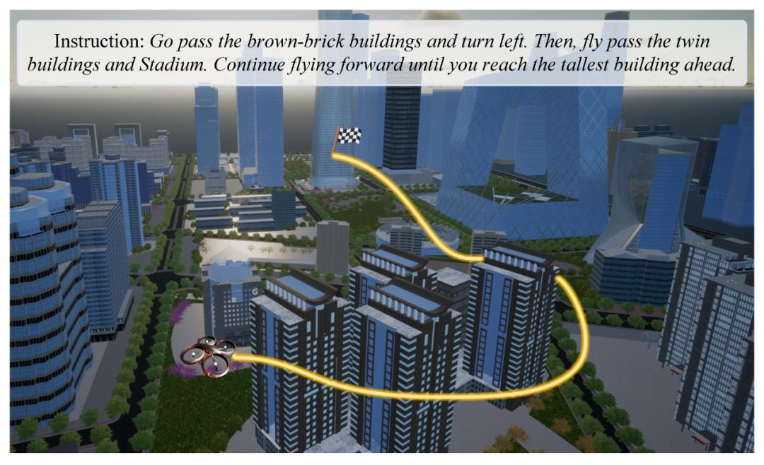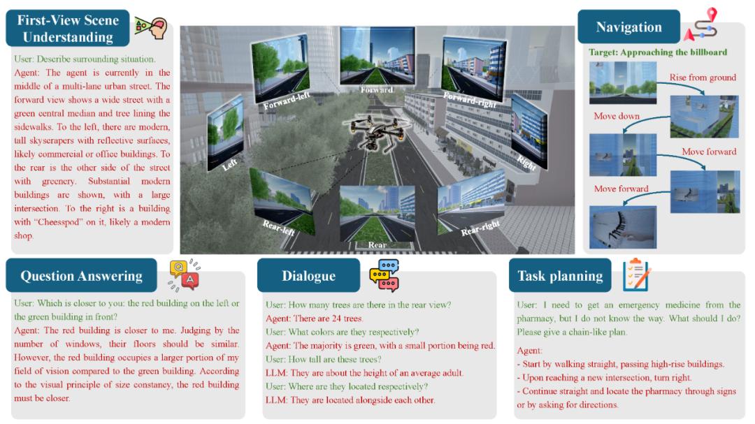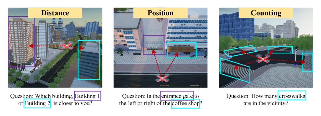2. 跨模态问答:智能体在了解具体情景的基础上,接受相关环境语义和空间信息的自然语言咨询,例如,「场景中有多少栋建筑?」以及「A建筑在当前视野下是否在B建筑的左侧?」输入RGB图像和相关环境问题,包括第一视角,直接用文字回答问题。