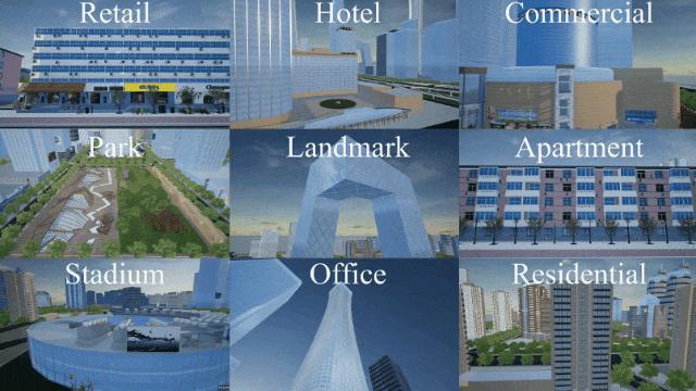 (2)建筑物:办公楼、购物中心、居民小区等,粗粒度建模还原真实建筑。