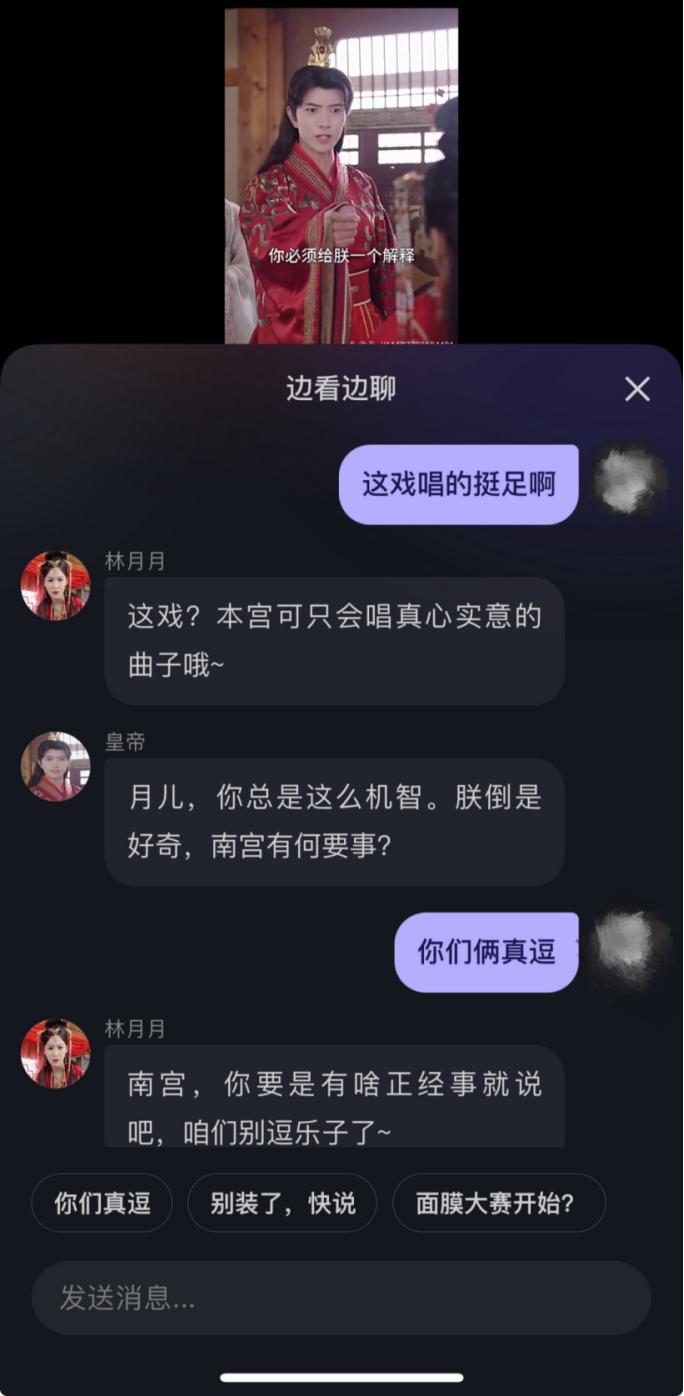 另外,三四个角色同时对话,没有明显的延迟感。甚至在对话开始的时候,因为对话屏幕太快,他们只能“见缝插针”。无论是使用官方提示还是自发提问,都没有太多“驴唇不对马嘴”的情况。刷过去的短剧,下次再进对话框,还是可以看到之前的对话记录,没有重复聊天的压力。