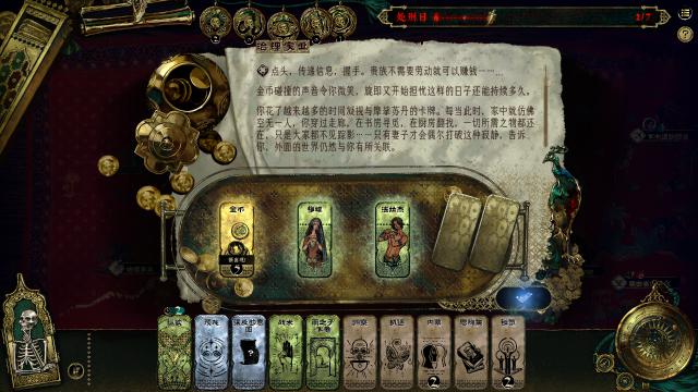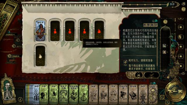 《苏丹的游戏》就像一个单人棋盘游戏或者一个跑步小组。游戏中的道具、金币、线索、思想甚至人,所有的资源都是用卡片来表达的。在游戏过程中,玩家应该将相应的卡片放在事件对应的网格上,决定这一轮的行动,并通过骰子确定事件的结果。