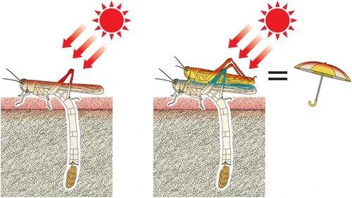 作为阳伞,男性蝗虫可以称之为尽职尽责。它们也会随着太阳的朝向而改变它们的位置——当太阳在天空中移动时,它们也会同步移动它们在雌性身上的位置。热成像仪表明,骑着男性蝗虫的女性比完全暴露在阳光下的女性温度低。
