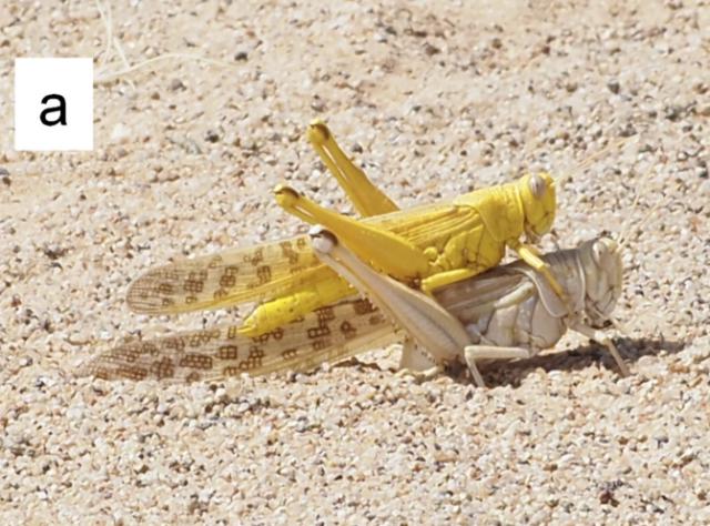 男士沙漠蝗虫(Schistocerca gregaria)骑着雌性蝗虫 | Koutaro Ould Maeno / 参考资料 [ 5 ]
