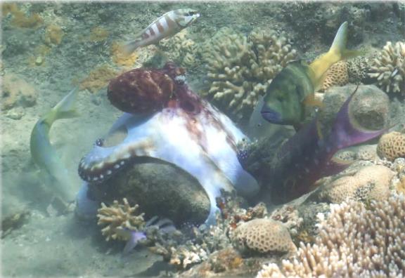最近的一项研究,科学家对近期的一项研究进行了分析 120 小时的水下 3D 数据,发觉章鱼与鱼类合作关系复杂。,互相“看眼睛”打猎。比如须鲷科的鱼会先在环境中搜索,然后通知章鱼哪里有猎物;章鱼会根据鱼给出的信息决定最合适的狩猎场所和具体的狩猎策略。章鱼抓到猎物后,鱼就可以一起吃饭了。
