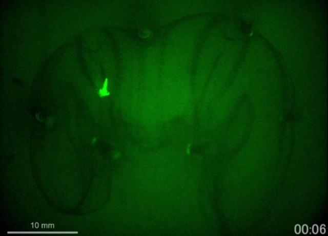 经过两排排水母的融合,它们的消化道也会融合在一起。科学家给融合体喂了含有荧光标记的食材。当食物从一个嘴里进入时,它们会通过结合的消化道,最后两个肛门会排出食物残留物。