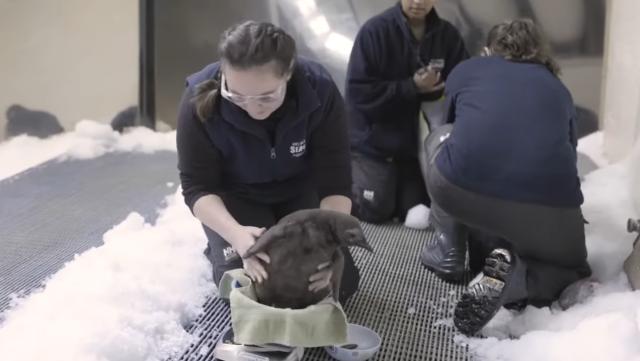 测量佩斯托的体重,此时它只有2个月大,已经是个小煤气罐了。 | Sea Life Melbourne Aquarium