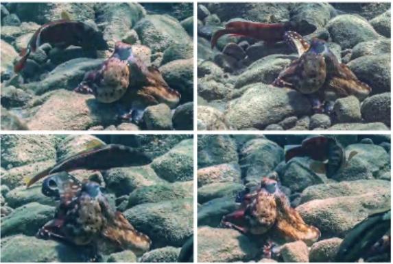 研究人员此前观察到,章鱼狩猎时,周围会出现鱼;但当时他们以为鱼只是来蹭剩菜,不参与狩猎过程。现在他们知道章鱼和鱼不仅有跨物种的社交能力,还可以利用社交信息进行复杂的合作,一起吃饭。