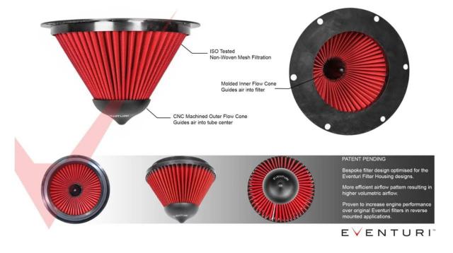 Eventuri 进气系统与许多其它售后进气系统大不相同,使用相同的锥形过滤器 / 管 / 与大多数进气系统相比,隔热罩等,Eventuri 该设计已获得专属专利。