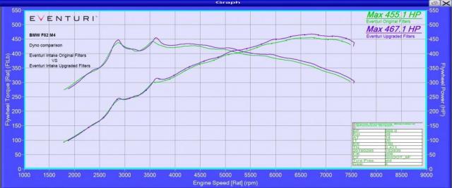 通过 Dyno 检测 Eventuri 与原装过滤器和升级过滤器相比,进气口的功率和扭矩都有所上升。这个验证 Eventuri 理论模型,证明升级后的过滤器确实对进气口的气流有显著影响。
