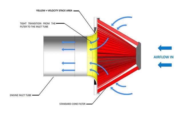 下面的图表显示了一个典型的售后进气系统,用锥形过滤器固定在发动机进气管上。过滤器采用标准堆栈,以黄色突出。