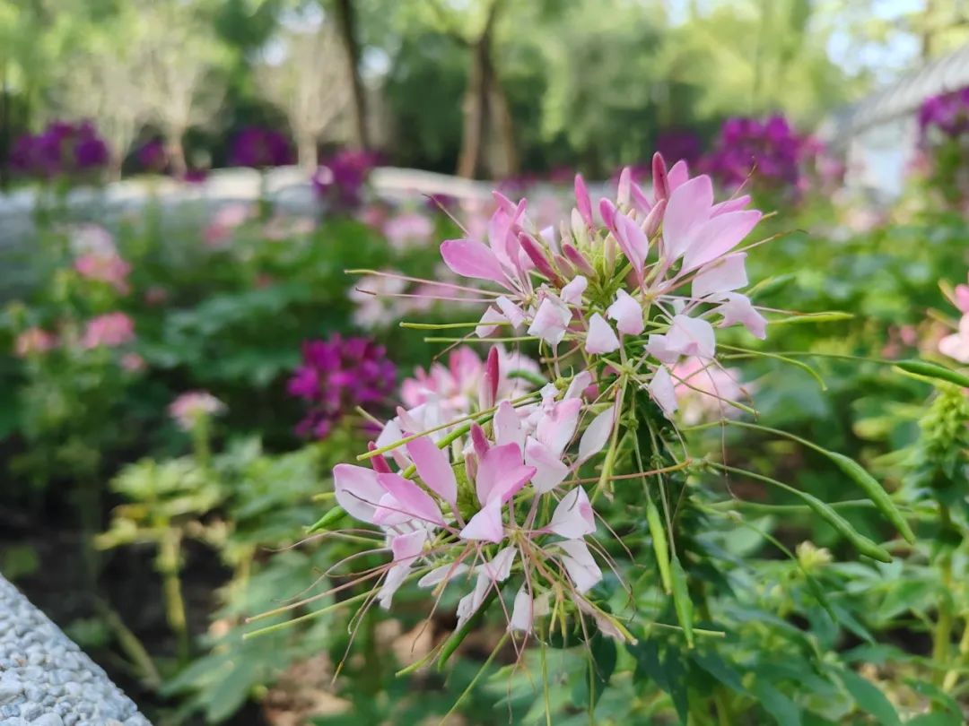 种子池里有几个花坛,坛子里盛开着粉色、红色和紫色的醉蝶花,就像一个五颜六色的画轴展现在我们面前。醉蝶花的花瓣像扇子一样团聚,花芯像蝴蝶一样飞舞,颜色娇艳迷人,看起来像一个丰富多彩的花球,在微风中轻轻摇曳。